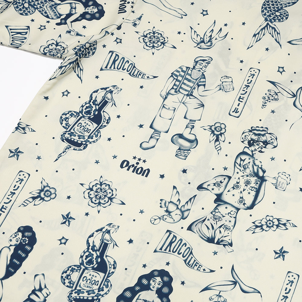 今回のアロハはイロカライフコラボ初となるロングスリーブタイプ。1色使いのシンプルなデザインながら、大きめの図柄でインパクトある仕上がりに。”ビール片手にみんなでエブリ嘉例(乾杯)しよう”という思いを込め、様々なキャラクターがオリオンビールで乾杯を掲げるデザインです(デザイン ynti_ryukyu)。