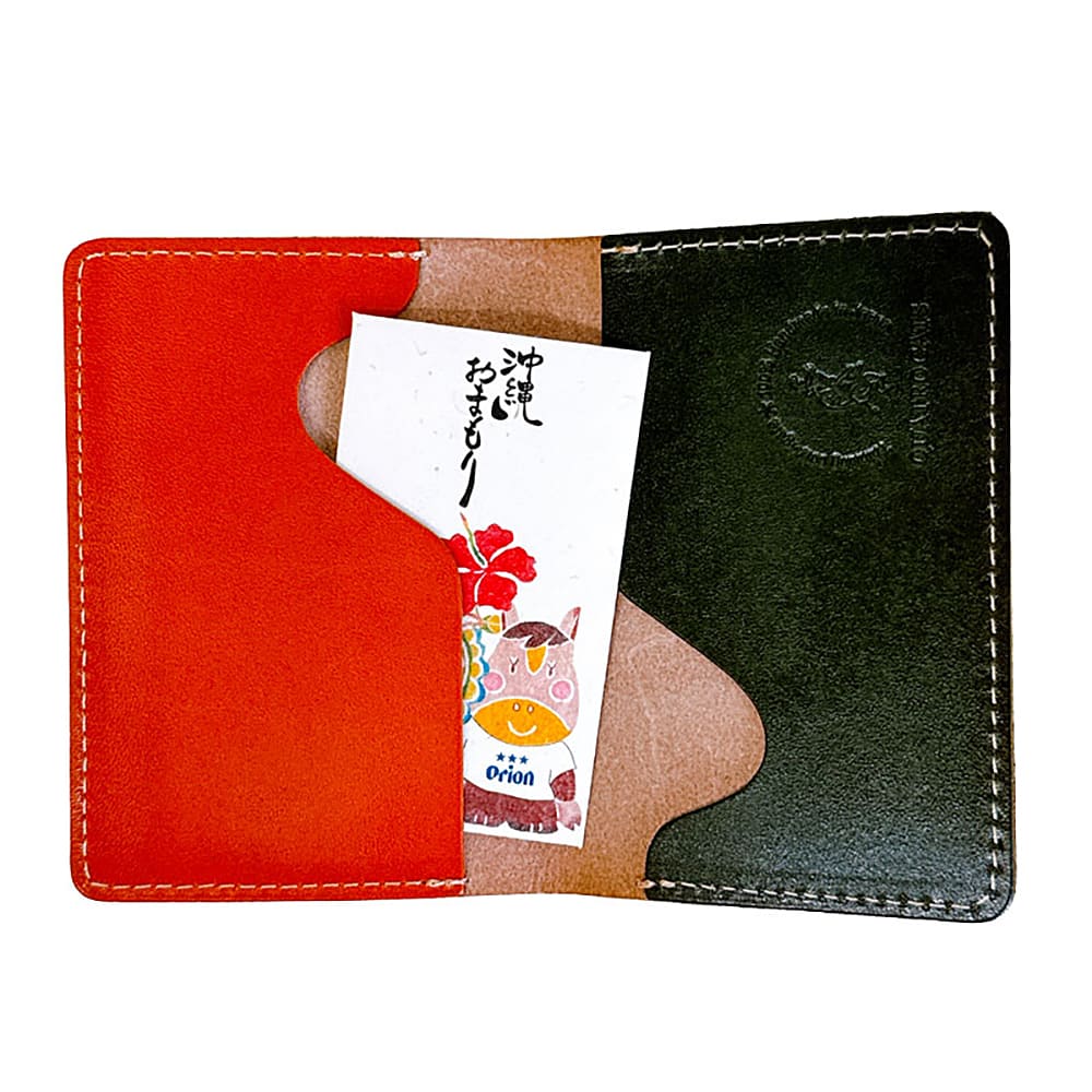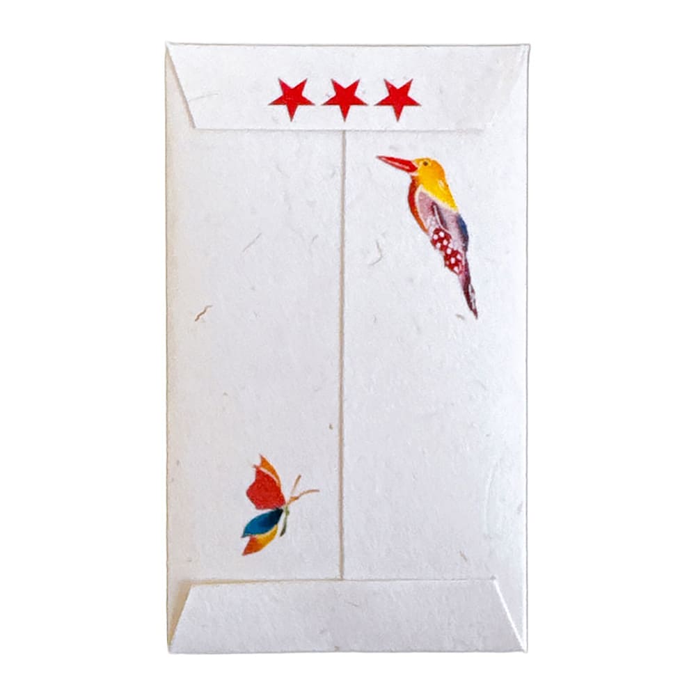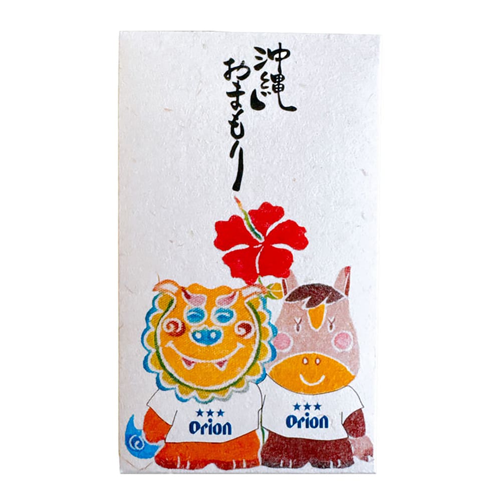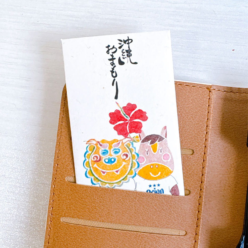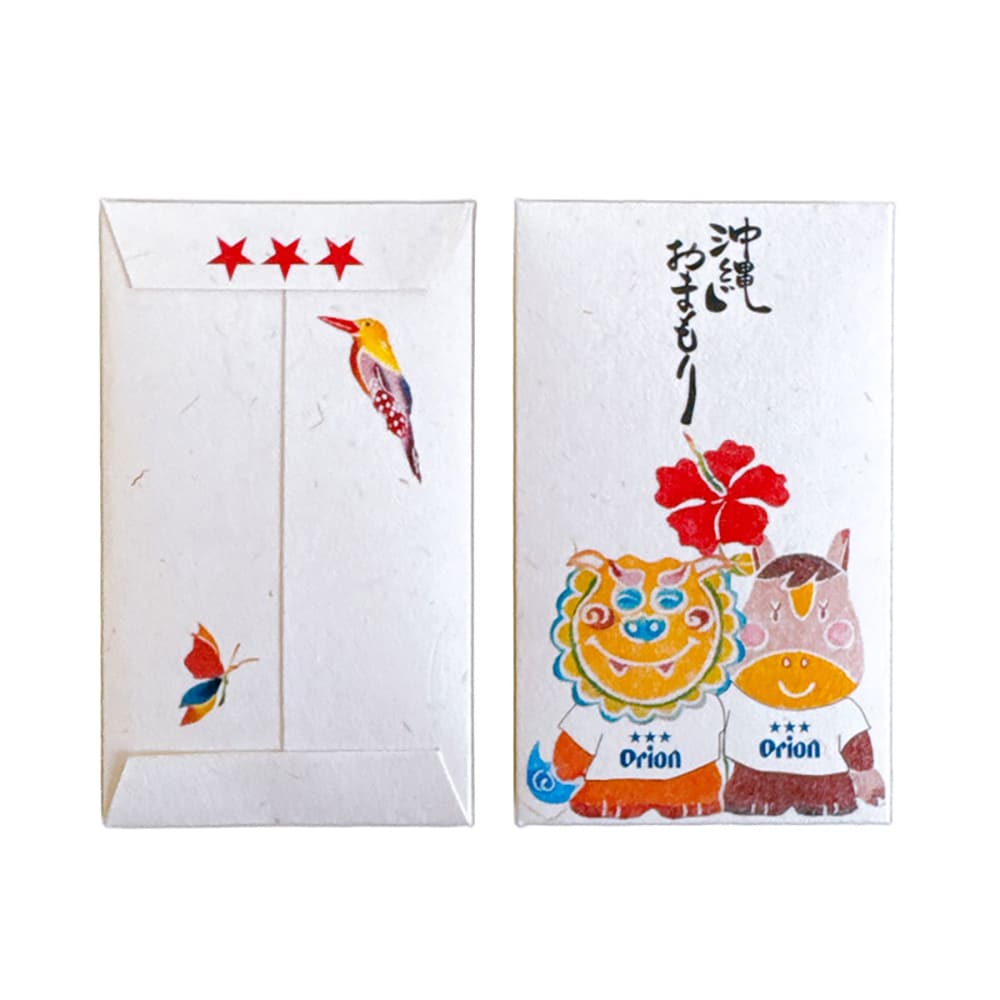 沖縄の初夏に咲く月桃から作られた「月桃紙(げっとうし)」に紅型の型染め技法を用いた作品をプリントし、沖縄の塩を入れた「沖縄おまもり」です。