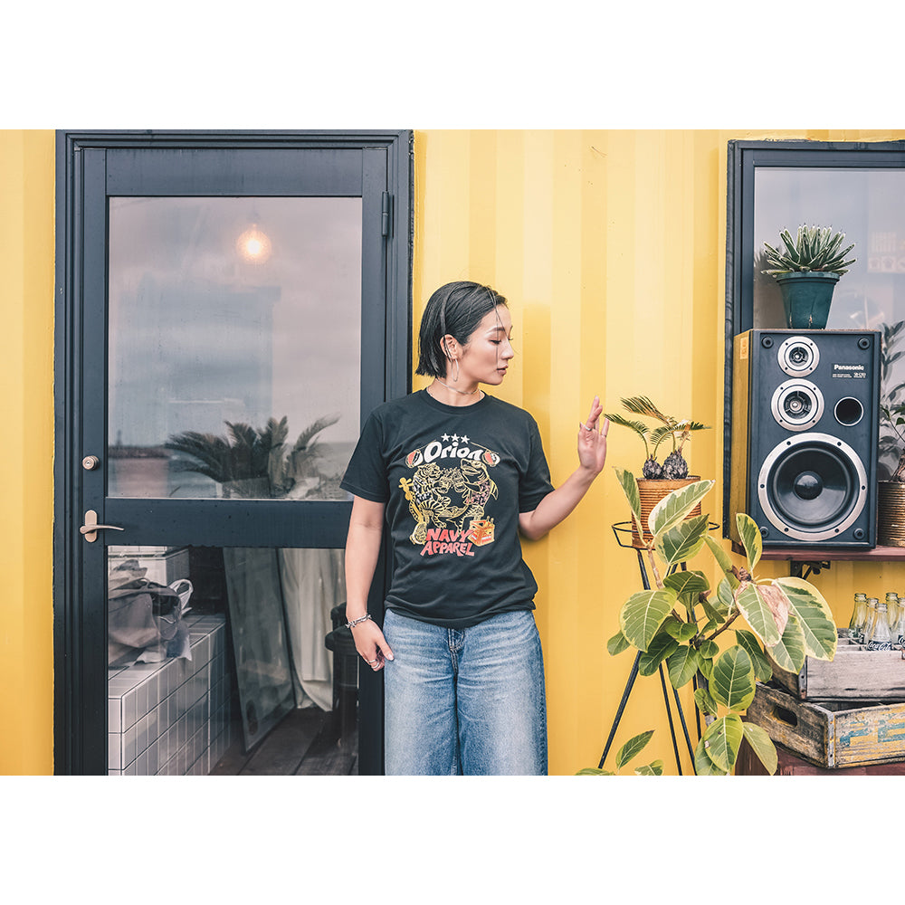 デザインは、沖縄の美しい海に生息する“タイガーシャーク(イタチザメ)”をモチーフに、沖縄生まれのオリオンビールとネイビーアパレルの遊び心溢れるコラボデザインに。タイガーシャークにちなんでオリオンアロハシャツを着た虎と鮫のキャラクターが、南国沖縄で三線の音色とオリオンビールを楽しみながら夏を満喫する賑やかな様子を描きました。