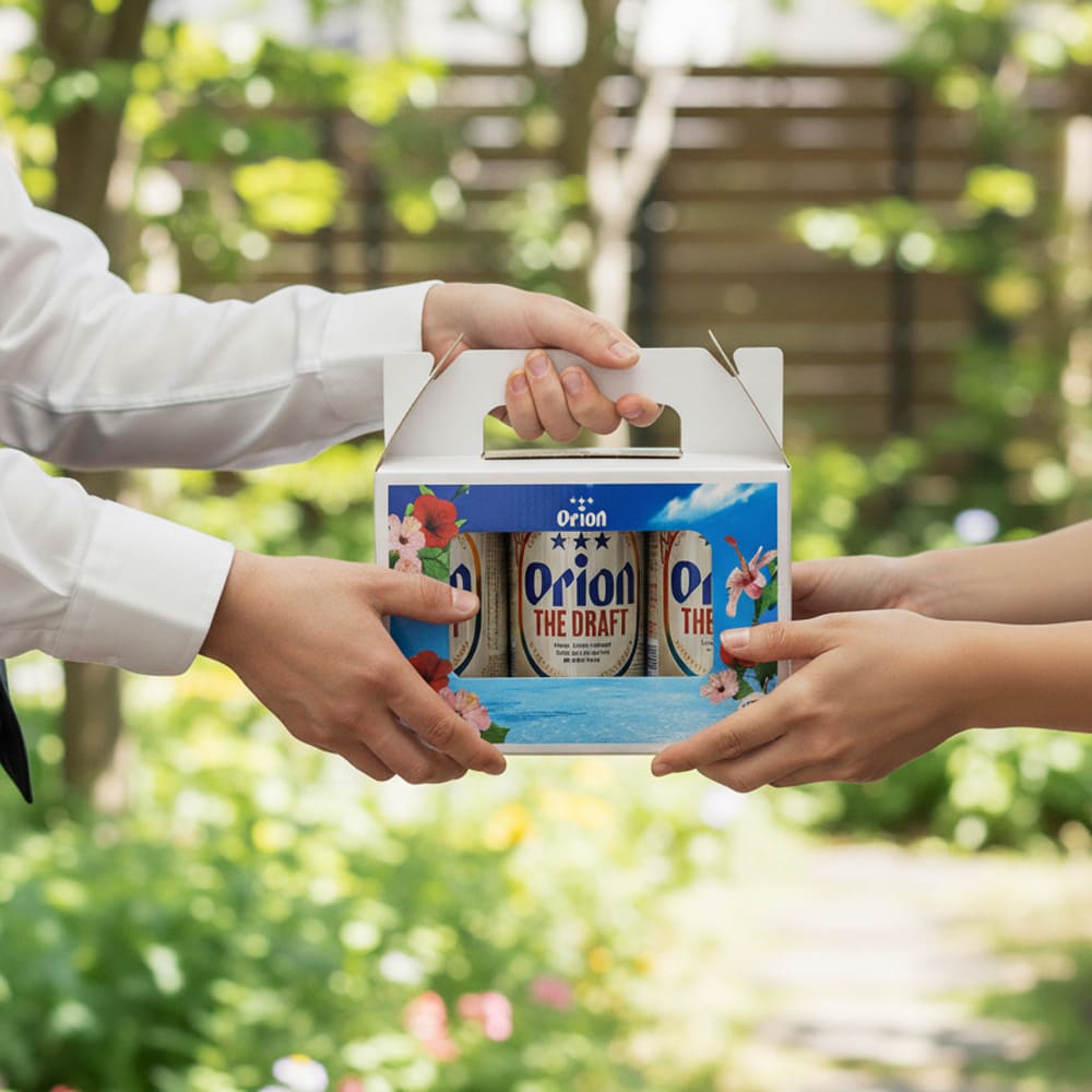 そんな時に大活躍する、オリオンビール公式通販限定のオリジナル手提げ箱(化粧箱)です。 裸のまま缶を手渡すのは気が引けるけれど、仰々しい包装までは必要ない…という、ちょっとした「おすそ分け」のシーンに最適です。
