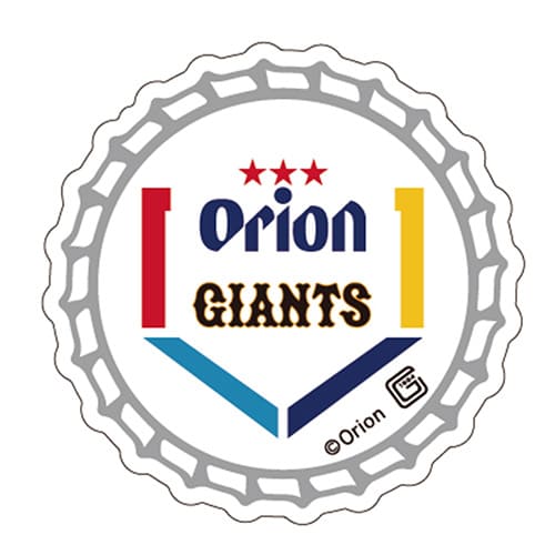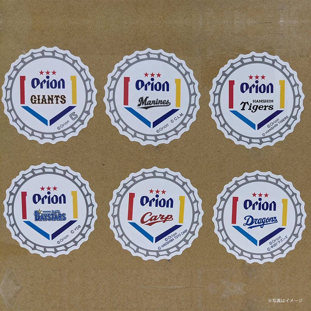 ビンビールの王冠(栓)に、ホームベース型のorion×球団ロゴをデザインしたオリジナルステッカー。