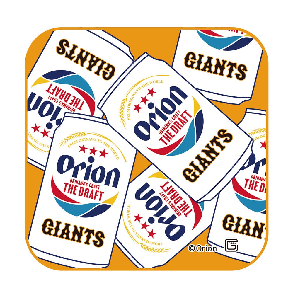 オリオン ザ・ドラフトの缶ビールに球団ロゴを掛け合わせた総柄デザインのハンドタオル。
