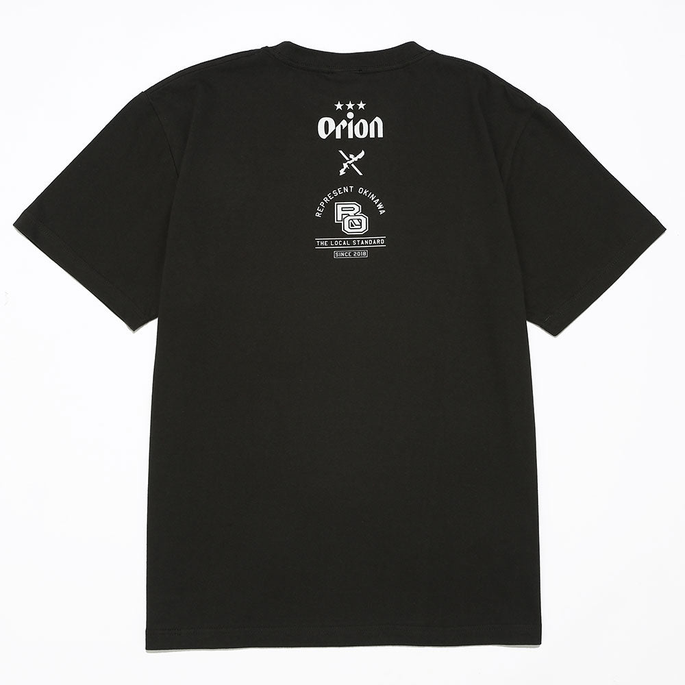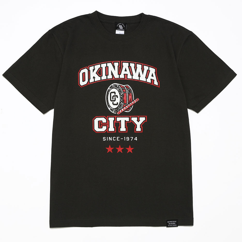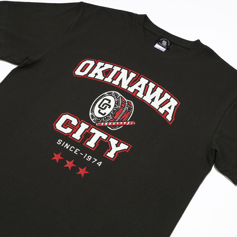 カレッジロゴ風に沖縄市特有のアメリカンな雰囲気と、エイサーの締め太鼓とバチを描き、オリオンの三ツ星ロゴを配置したカジュアルな1着。
