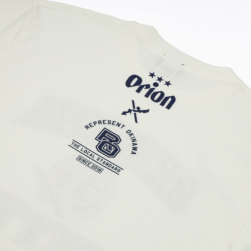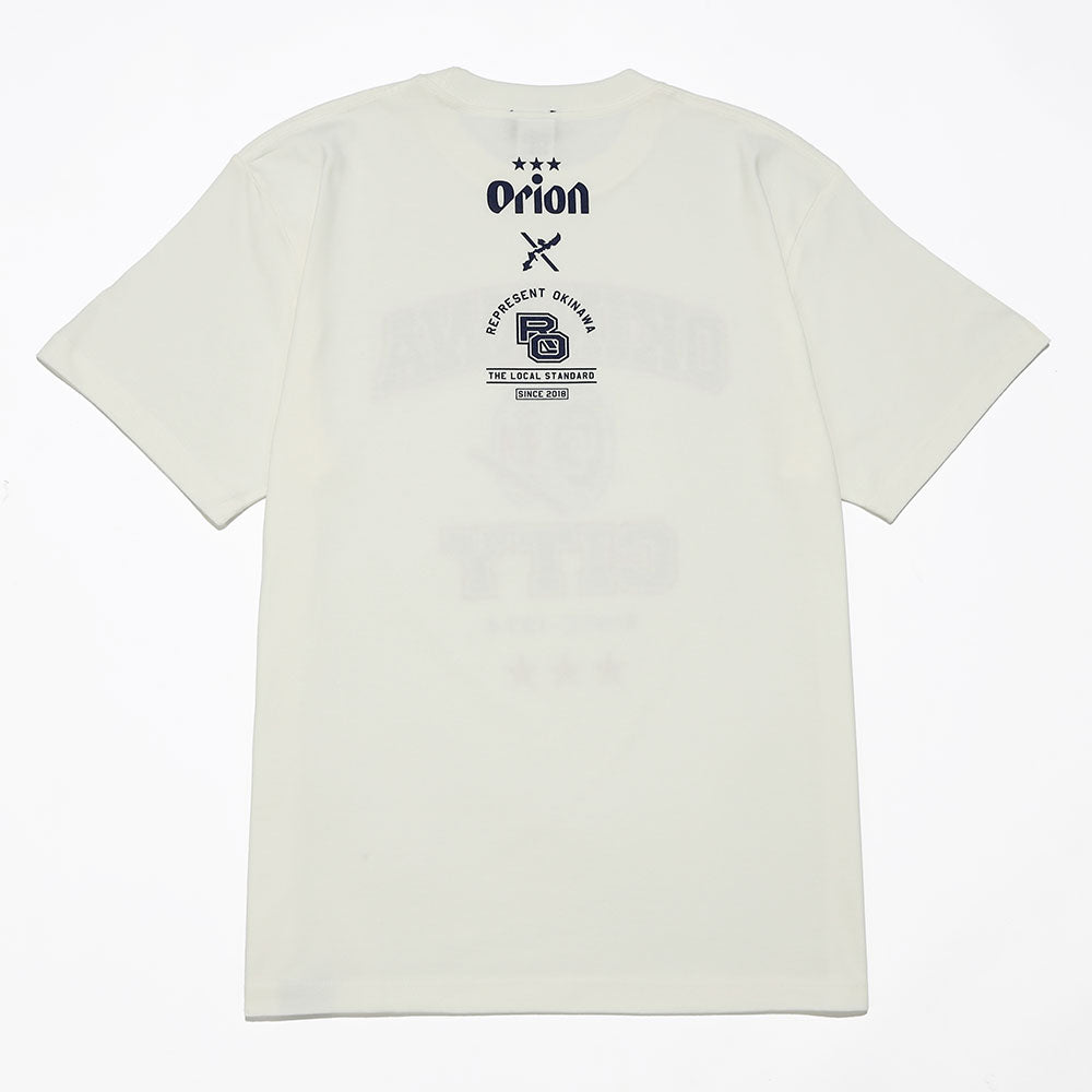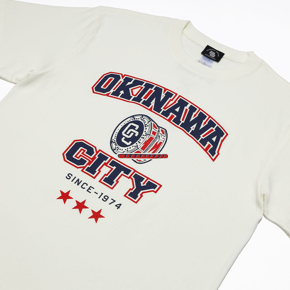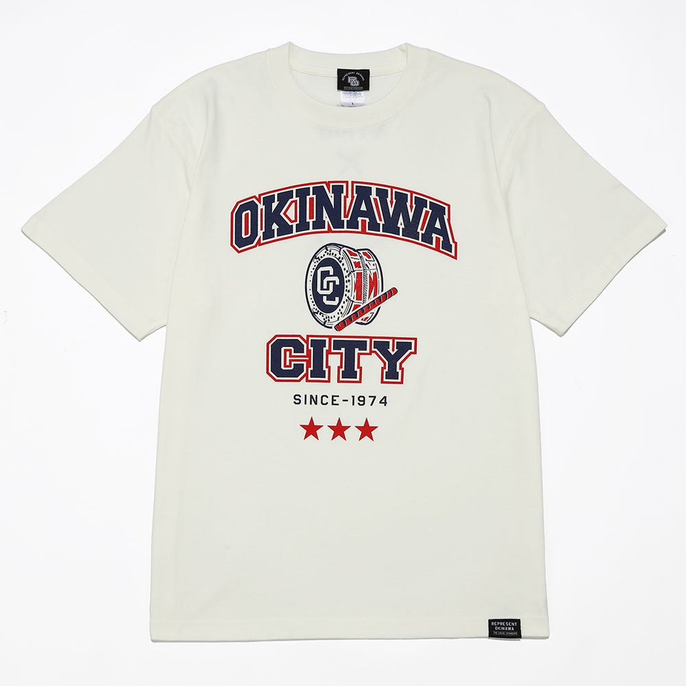 カレッジロゴ風に沖縄市特有のアメリカンな雰囲気と、エイサーの締め太鼓とバチを描き、オリオンの三ツ星ロゴを配置したカジュアルな1着。
