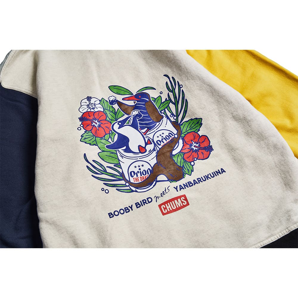 フロントデザインは、ORION×CHUMSのコラボを象徴する2社のブランドロゴを配置、バックデザインはCHUMSのマスコット「ブービーバード」と、沖縄本島北部のやんばるエリアにのみ生息する野鳥「ヤンバルクイナ」が、ガジュマルの木の上でオリオンビールを楽しむ仲睦まじい姿をデザインしています。
