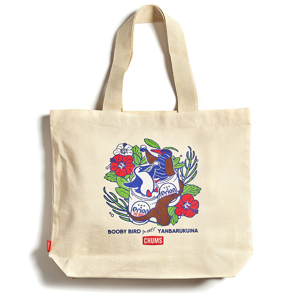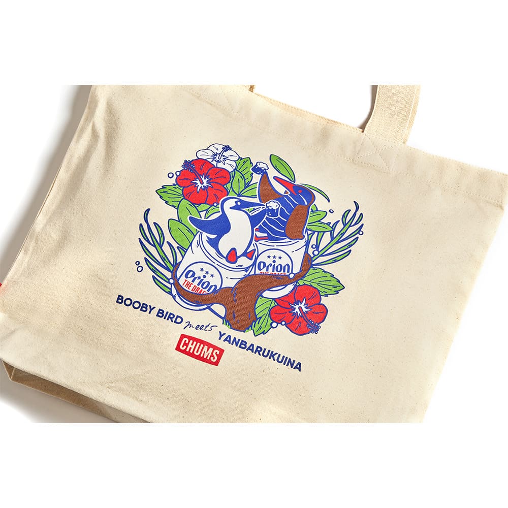こちらの定番のトートバッグは、お買い物などの日常使いから、ピクニックなどちょっとしたアウトドアにも便利なアイテム。デザインはCHUMSのマスコット「ブービーバード」と、沖縄本島北部のやんばるエリアにのみ生息する野鳥「ヤンバルクイナ」が、ガジュマルの木の上でオリオンビールを楽しむ仲睦まじい姿が大きくプリントされた可愛さと注目度抜群のデザイン。