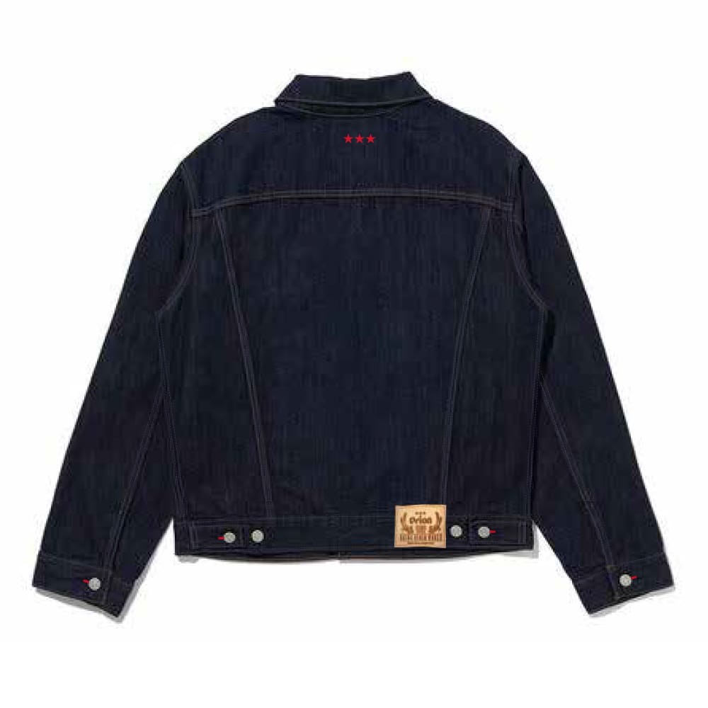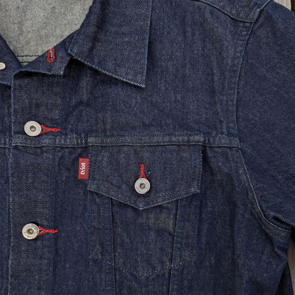 さらに胸ポケットにはorionロゴ入りの赤いピスネーム、ポケットや衿・袖の裏側にorionロゴのモノグラム生地を使用、後衿下にワンポイントで三ツ星の刺繍、後ろの裾にオリジナルデザインの革パッチを付けました。細部にまでこだわったorionコラボならではの一着です。