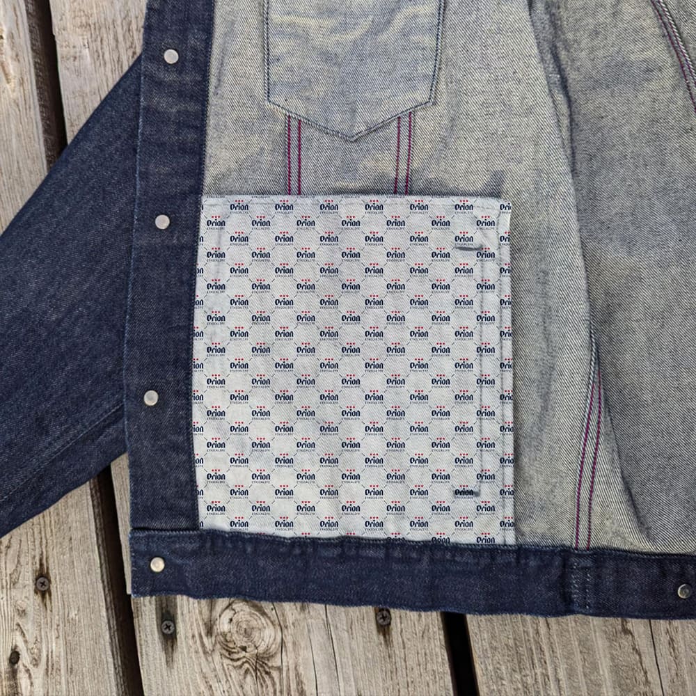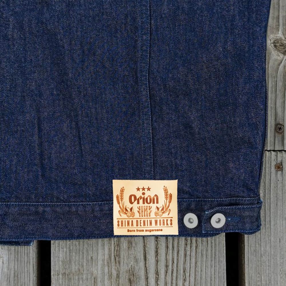 - orionロゴのモノグラムをバガス生地にプリントしたものを腰ポケット、胸ポケット、衿裏、袖口裏に使用。