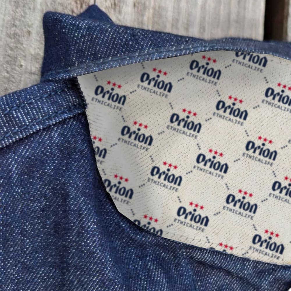 できあがった生地に、オリオンロゴとSHIMA DENIM WORKSが展開するサステナブルな衣料・雑貨ブランド「ETHICALIFE」のモノグラム柄をプリント。このコラボだけのオリジナルデザインです。