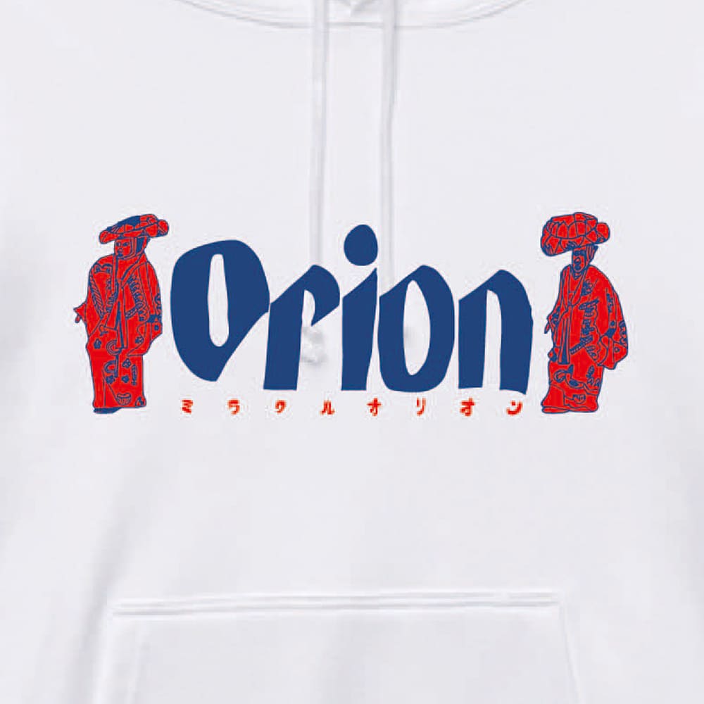 こちらの「ミラクルオリオン 花笠パーカー」は、沖縄らしさとミラクルくんの個性が融合した特別なデザインパーカーです。オリオンのロゴを中央に配置し、ロゴの両側には花笠をかぶった琉球舞踊をイメージした華やかなデザインをあしらい、沖縄の伝統と文化が感じられる仕上がりとなっています。