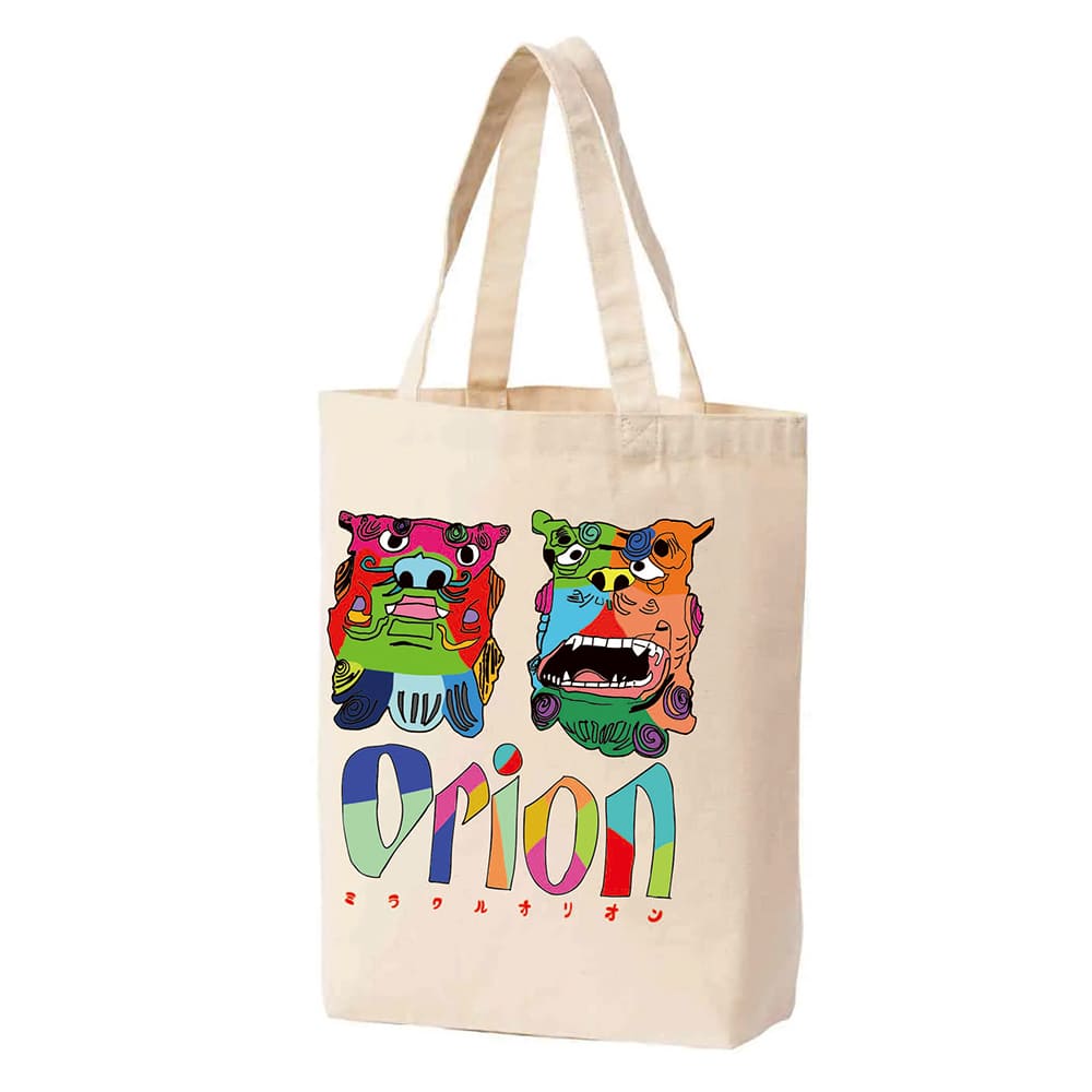 こちらの「ミラクルオリオン シーサートートバッグ」は、沖縄らしさとミラクルくんの個性が融合した特別なトートバッグです。沖縄の守り神として親しまれるシーサーをイメージした迫力のあるデザインをあしらい、オリオンのロゴを配置した特別なバッグです。