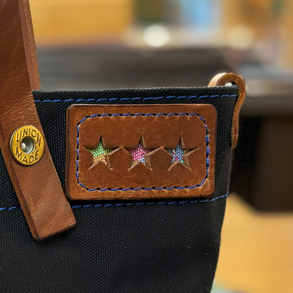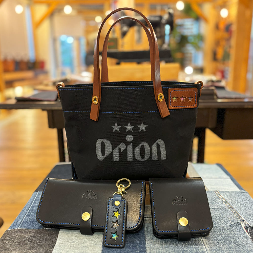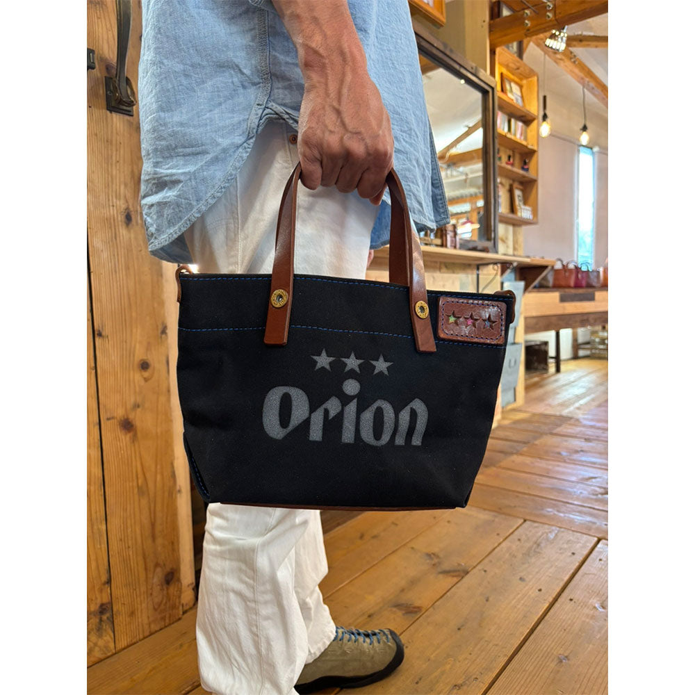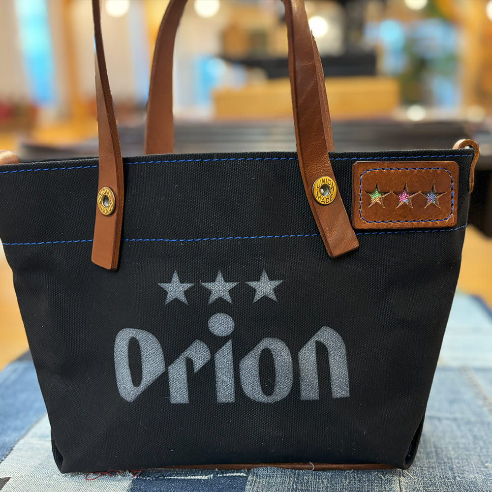 中央にシンプルなORIONロゴを吹き付け、バッグのネームとしてうらそえ織の生地を縫製した三ツ星ロゴの革パッチをアクセントにしたオリオン公式通販限定のオリジナル帆布トートバッグ。
