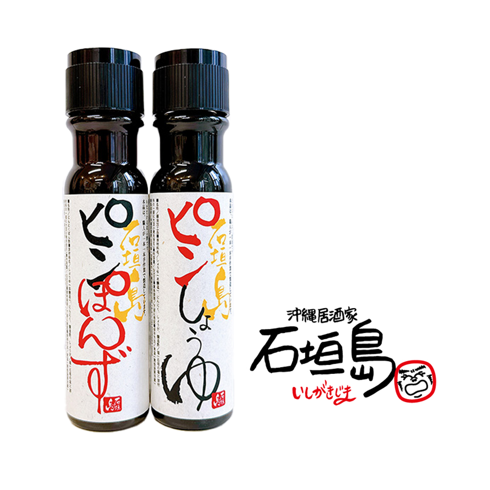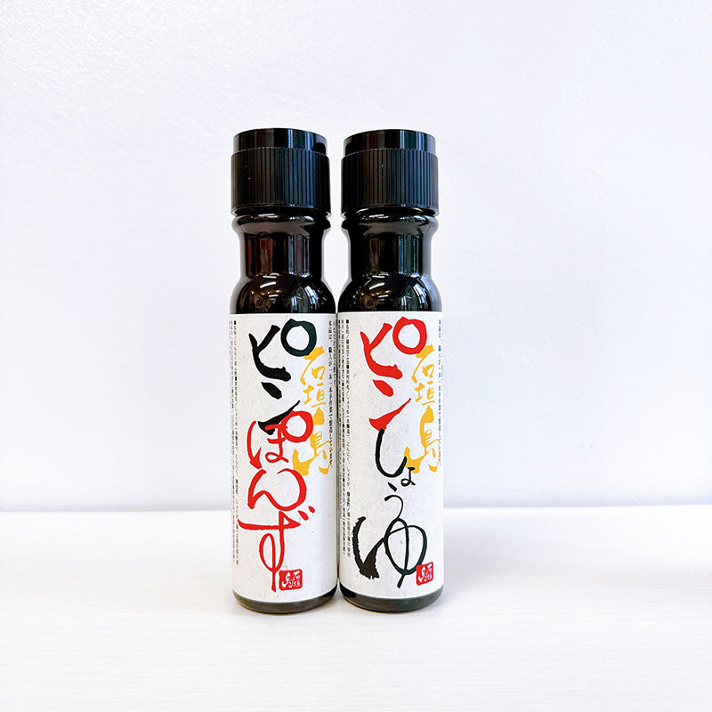 15年前、料理で使っている調味料を分けてほしい、そんなお客様のリクエストから商品化した当店オリジナル調味料の「石垣島のピンしょうゆ」「石垣島のピンぽんず」「石垣島のピン肉マン」です。