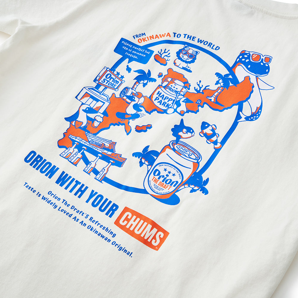 大人気のTシャツは、両ブランドのシンボルに加え、シーサーやジンベエザメなど沖縄要素を組み合わせたCHUMS×ORIONコラボならではのデザイン。2種類のデザイン×各6色のバリエーションをご用意しておりますので、お気に入りの1着を見つけてくださいね。