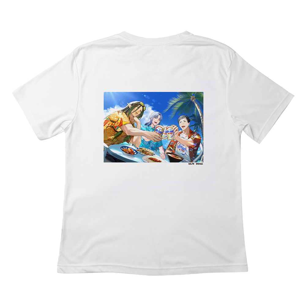 こちらの「みんな集合で乾杯(カリー)Tシャツ」は、正面は定番のオリオン ザ・ドラフトTシャツ。バックのデザインには、にじさんじの花畑チャイカさん、ミラン・ケストレルさん、社築さんが沖縄の海を背景にオリオンビールで乾杯する様子をデザイン。