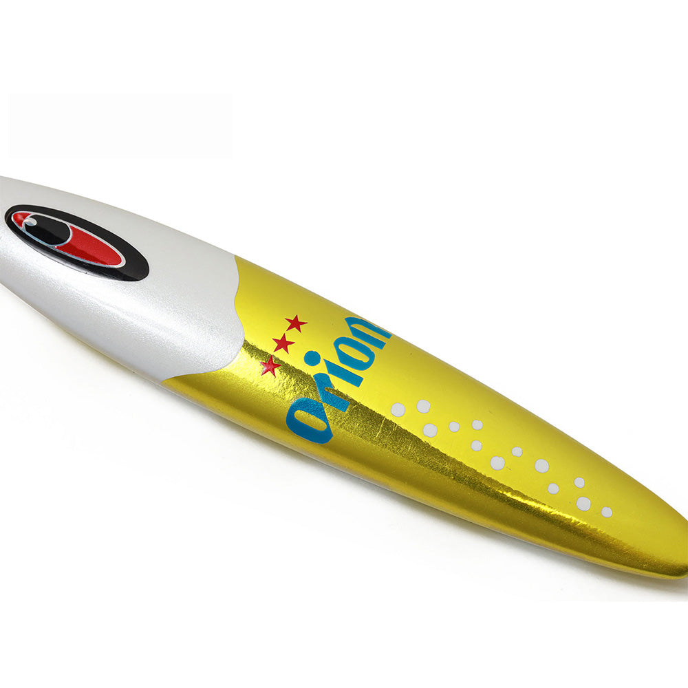 ジギングメーカーのパイオニア”SEAFLOOR CONTROL”(シーフロアコントロール)が自社工場で手作りで生産するジグの中から全魚種対応の”abyss(アビス)”をチョイス。 カラーリングは、グラスに注がれたビールそのものをイメージ。琥珀色に輝くゴールドの液体と、きめ細かく立ち上がる白い泡をリアルに表現し、視覚的インパクトと遊び心を兼ね備えたデザインに仕上がりました。 釣り場に持ち込めば、まるで“海の中で乾杯”しているような気分に。見ても楽しく、使って釣れる——そんな特別な1本が、あなたのタックルボックスを彩ります。 全魚種対応のスペシャルコラボジグとなっておりますので、夢の大物をゲットしてオリオンビールで乾杯してください♪