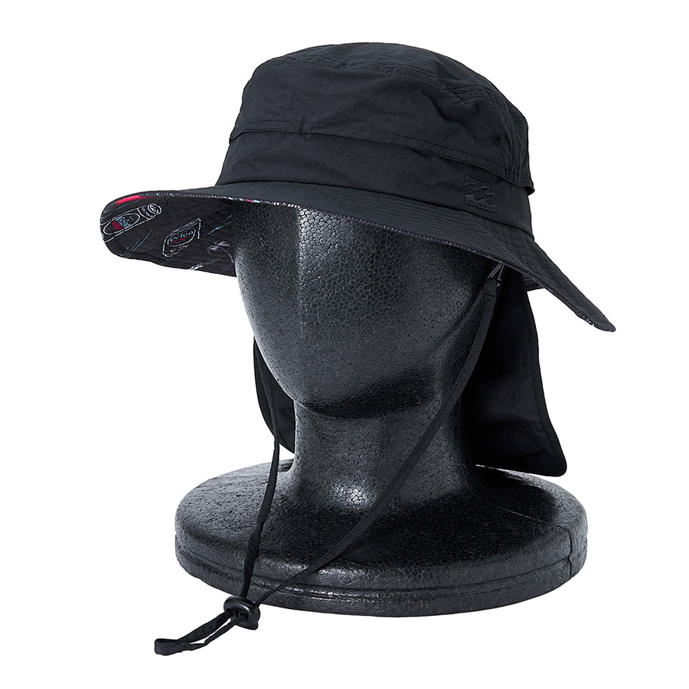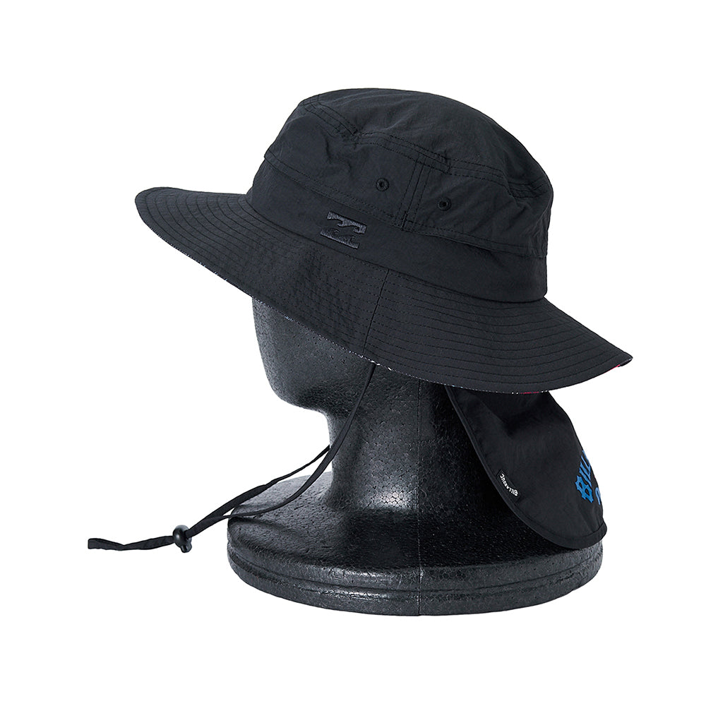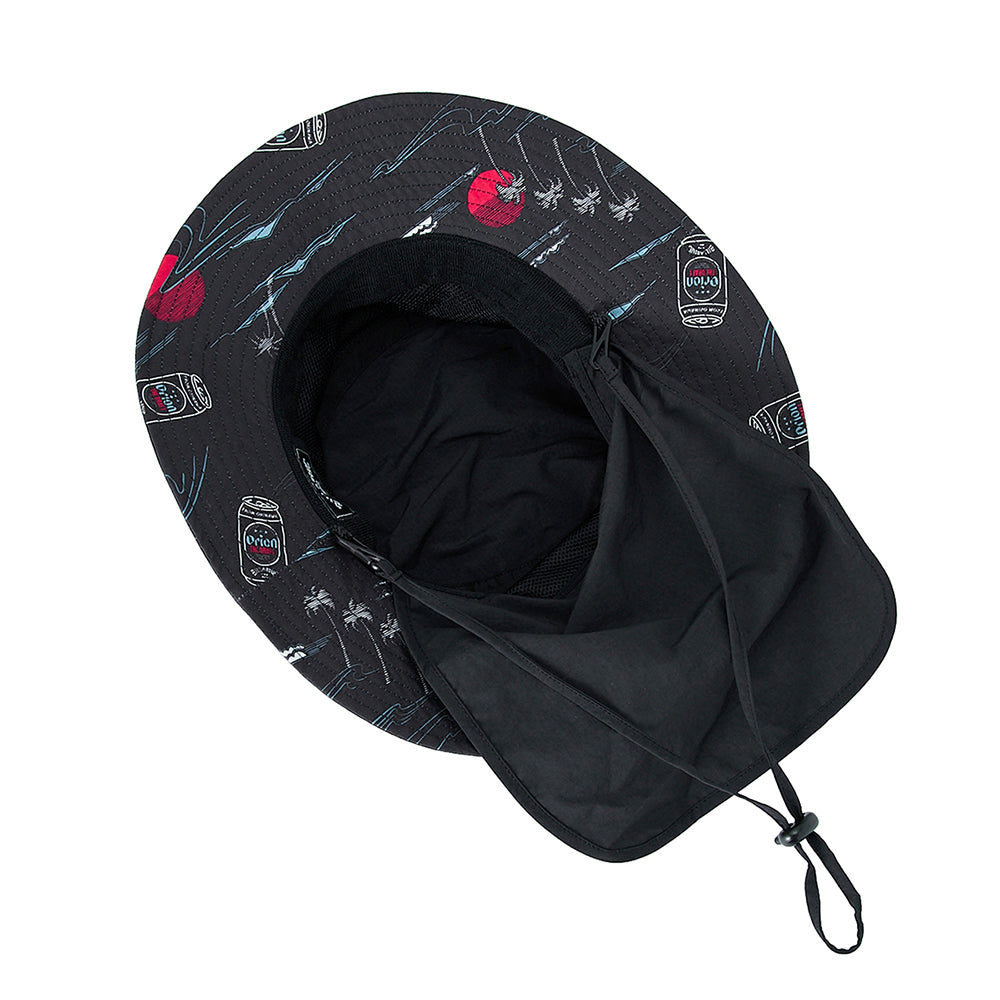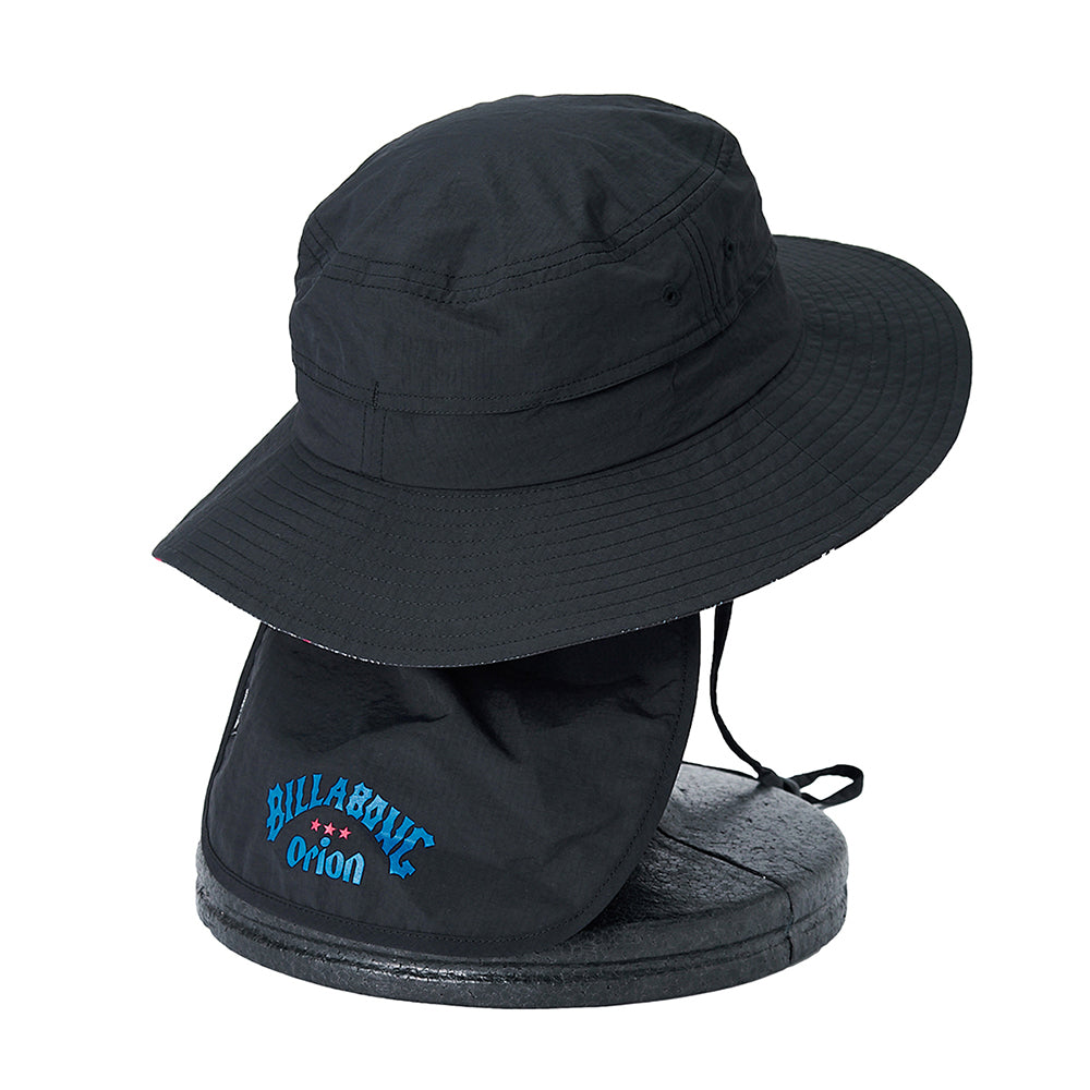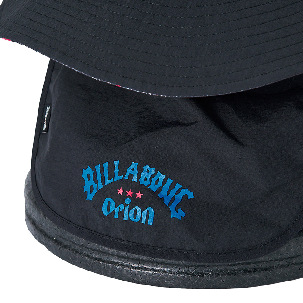 UV プロテクション(UPF50+)を備えたハット。メイン素材にポリエステルを使用し、首の日焼けを防止するサンシェードには、ORIONBEER とBILLABONG のロゴをプリントしました。便利なループストラップ付きで、水陸どちらでも使用可能です。サイドにワンポイントと、たれ部分にコラボロゴを配置。