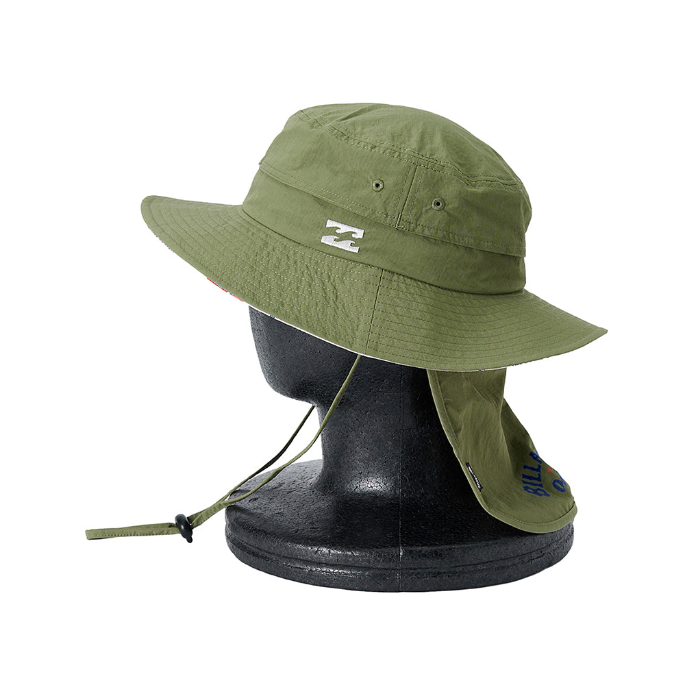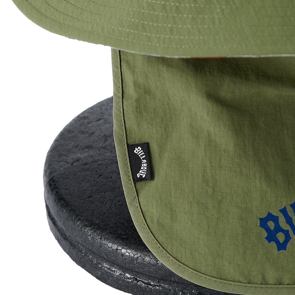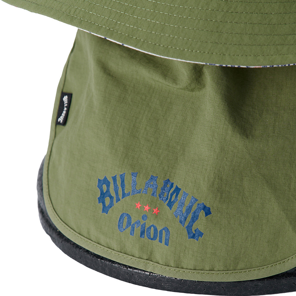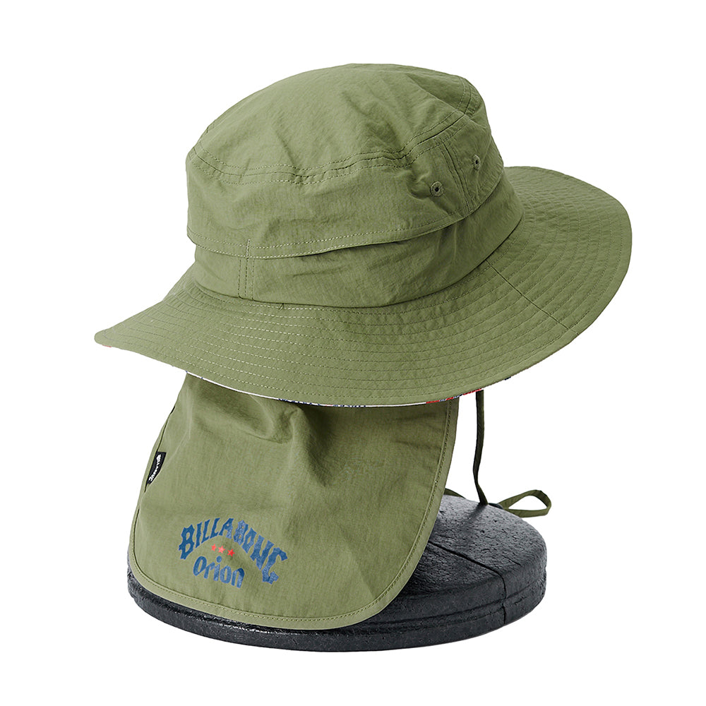 UV プロテクション(UPF50+)を備えたハット。メイン素材にポリエステルを使用し、首の日焼けを防止するサンシェードには、ORIONBEER とBILLABONG のロゴをプリントしました。便利なループストラップ付きで、水陸どちらでも使用可能です。サイドにワンポイントと、たれ部分にコラボロゴを配置。
