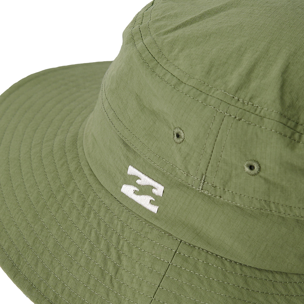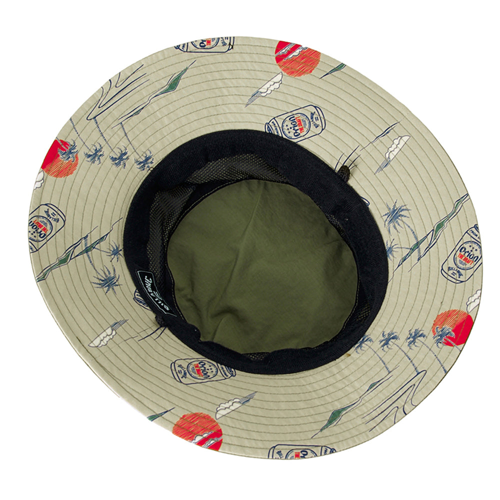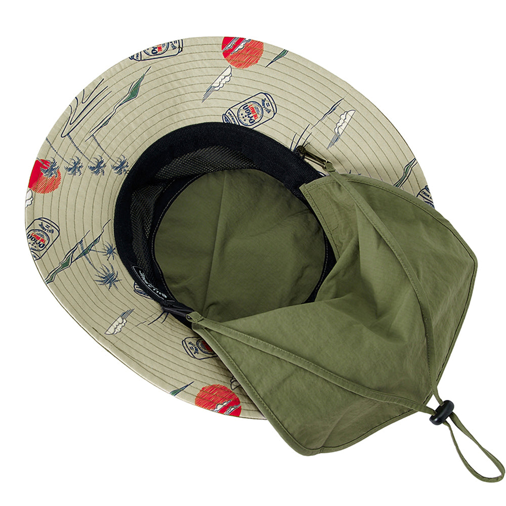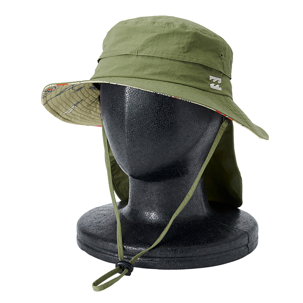 UV プロテクション(UPF50+)を備えたハット。メイン素材にポリエステルを使用し、首の日焼けを防止するサンシェードには、ORIONBEER とBILLABONG のロゴをプリントしました。便利なループストラップ付きで、水陸どちらでも使用可能です。サイドにワンポイントと、たれ部分にコラボロゴを配置。