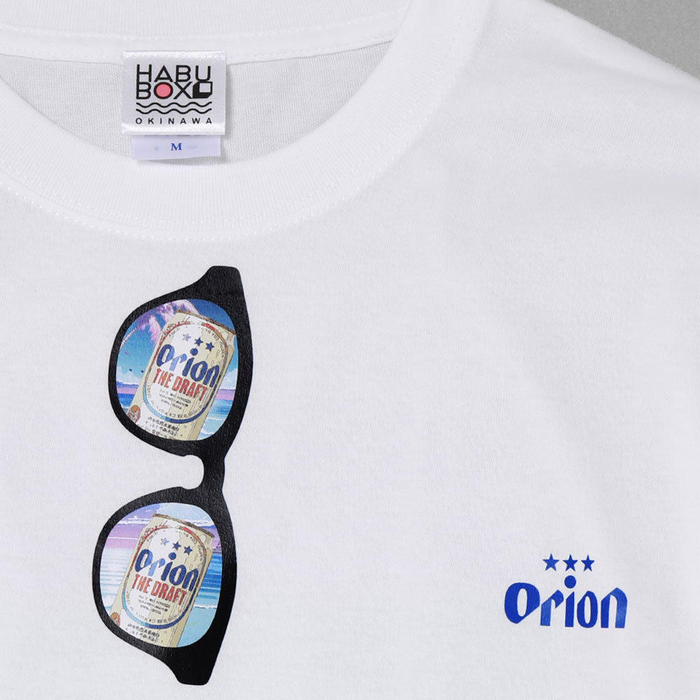 サングラスに映る缶ビールが、「オリオンビール越しに世界を見ている」ような遊び心を感じさせます。
