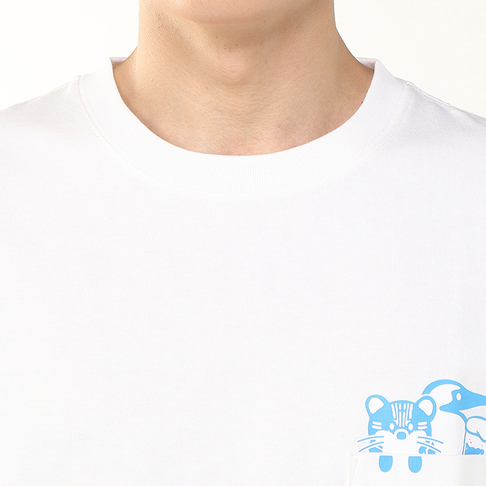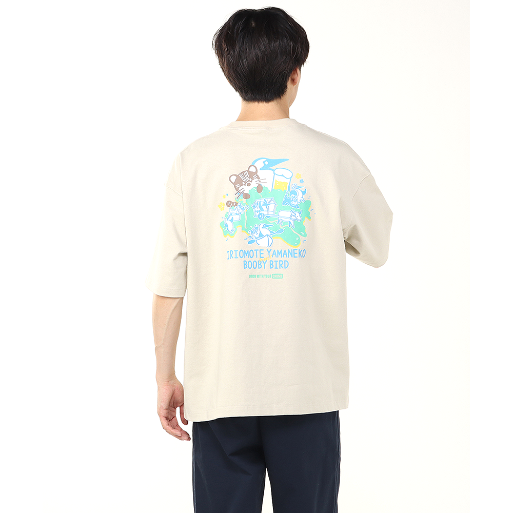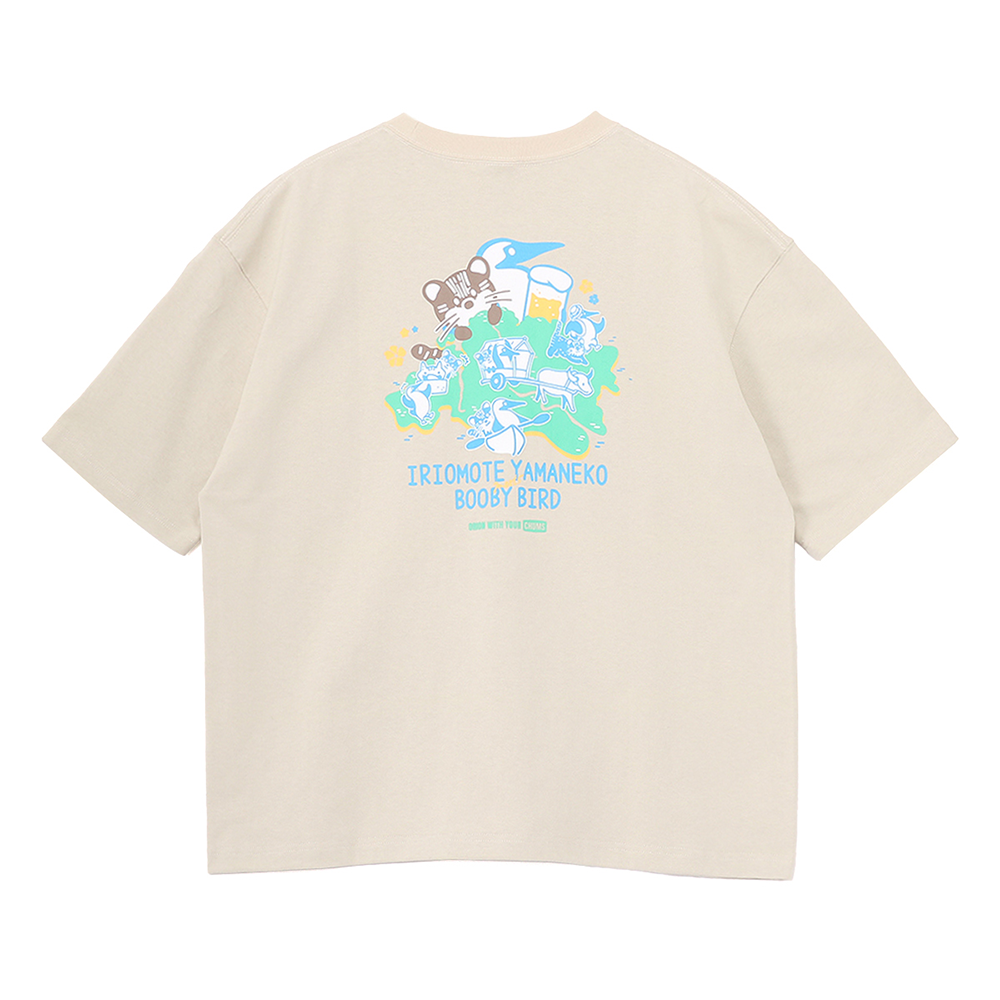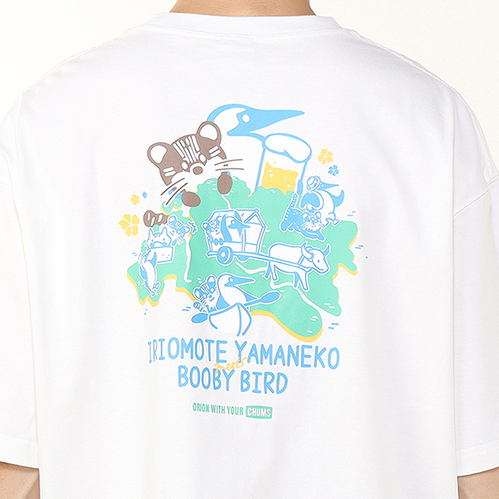 フロントデザインは、胸元ポケットからブービーバードとイリオモテヤマネコがひょっこりと顔を出すキュートなデザイン。バッグデザインは、ブービーバードとイリオモテヤマネコが自然豊かな西表島でアクティビティを楽しむ様子を描きました。
