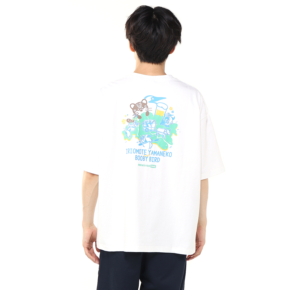 フロントデザインは、胸元ポケットからブービーバードとイリオモテヤマネコがひょっこりと顔を出すキュートなデザイン。バッグデザインは、ブービーバードとイリオモテヤマネコが自然豊かな西表島でアクティビティを楽しむ様子を描きました。