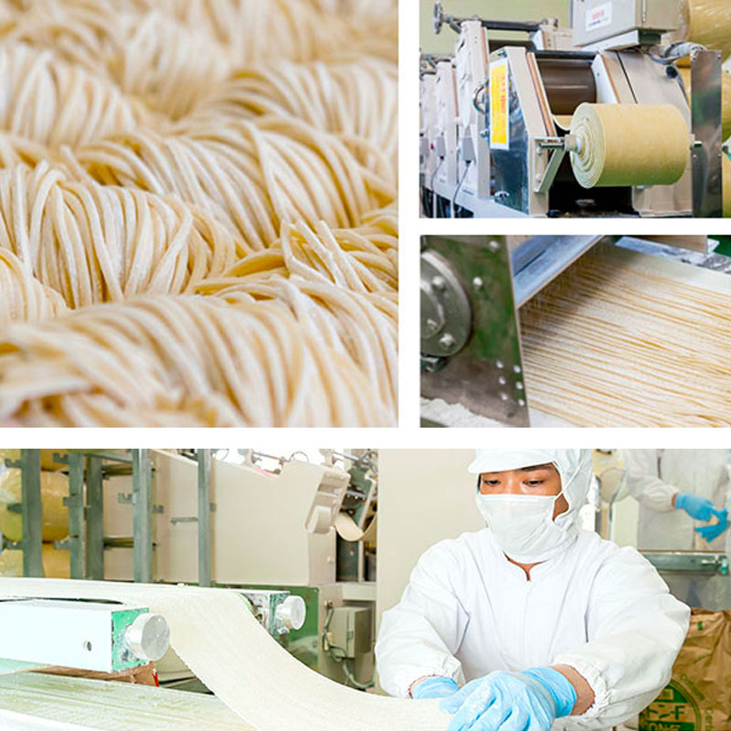 麺の食味を決定づける大きな要素は、適切な粉選びとその配合。与那覇製麺では、粉の特徴を知り尽くした複数の単一等級製麺技師を有し、経験に基づくさじ加減で、微妙な調整をして小麦粉やその他の原料の配合を行っています。