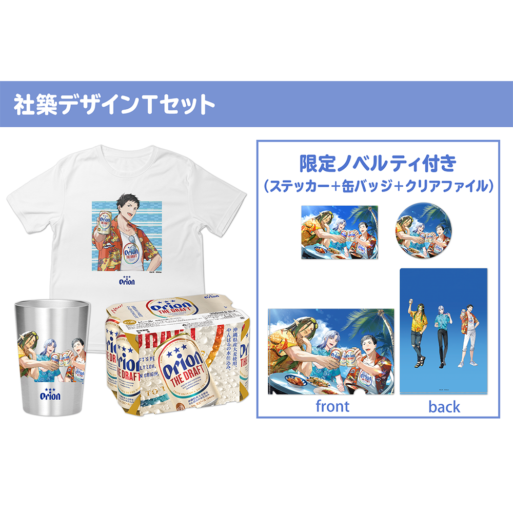 本商品は、Tシャツとステンレスタンブラーに「オリオン ザ・ドラフト」6缶パック、さらに限定ノベルティグッズ「缶バッチ」「クリアファイル」「ステッカー」の3点がついたセット商品です。