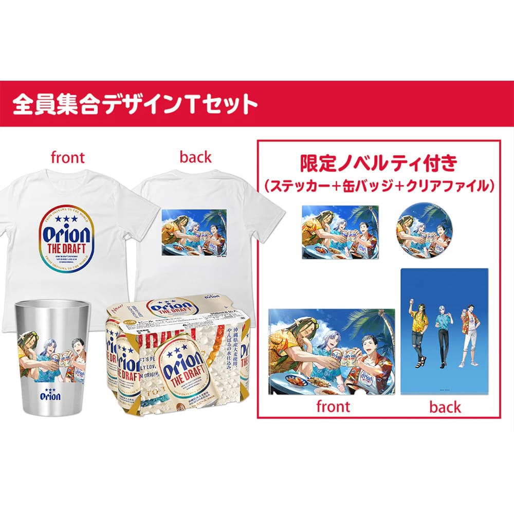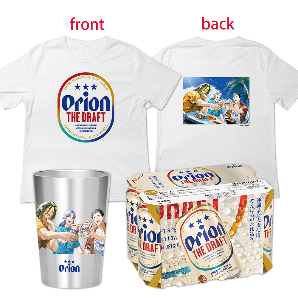 本商品は、Tシャツとステンレスタンブラーに「オリオン ザ・ドラフト」6缶パック、さらに限定ノベルティグッズ「缶バッチ」「クリアファイル」「ステッカー」の3点がついたセット商品です。