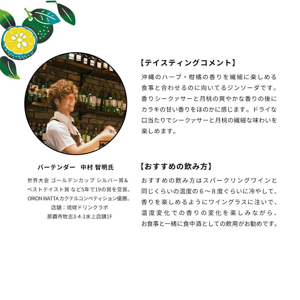 沖縄のハーブ・柑橘の香りを繊細に楽しめる 食事と合わせるのに向いてるジンソーダです。香り シークァサーと月桃の爽やかな香りの後にカラキの甘い香りをほのかに感じます。ドライな口当たりでシークァサーと月桃の繊細な味わいを楽しめます。