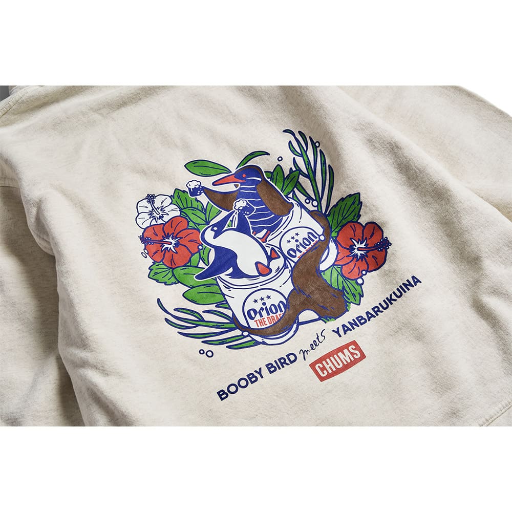 フロントデザインは、ORION×CHUMSのコラボを象徴する2社のブランドロゴを配置、バックデザインはCHUMSのマスコット「ブービーバード」と、沖縄本島北部のやんばるエリアにのみ生息する野鳥「ヤンバルクイナ」が、ガジュマルの木の上でオリオンビールを楽しむ仲睦まじい姿をデザインしています。