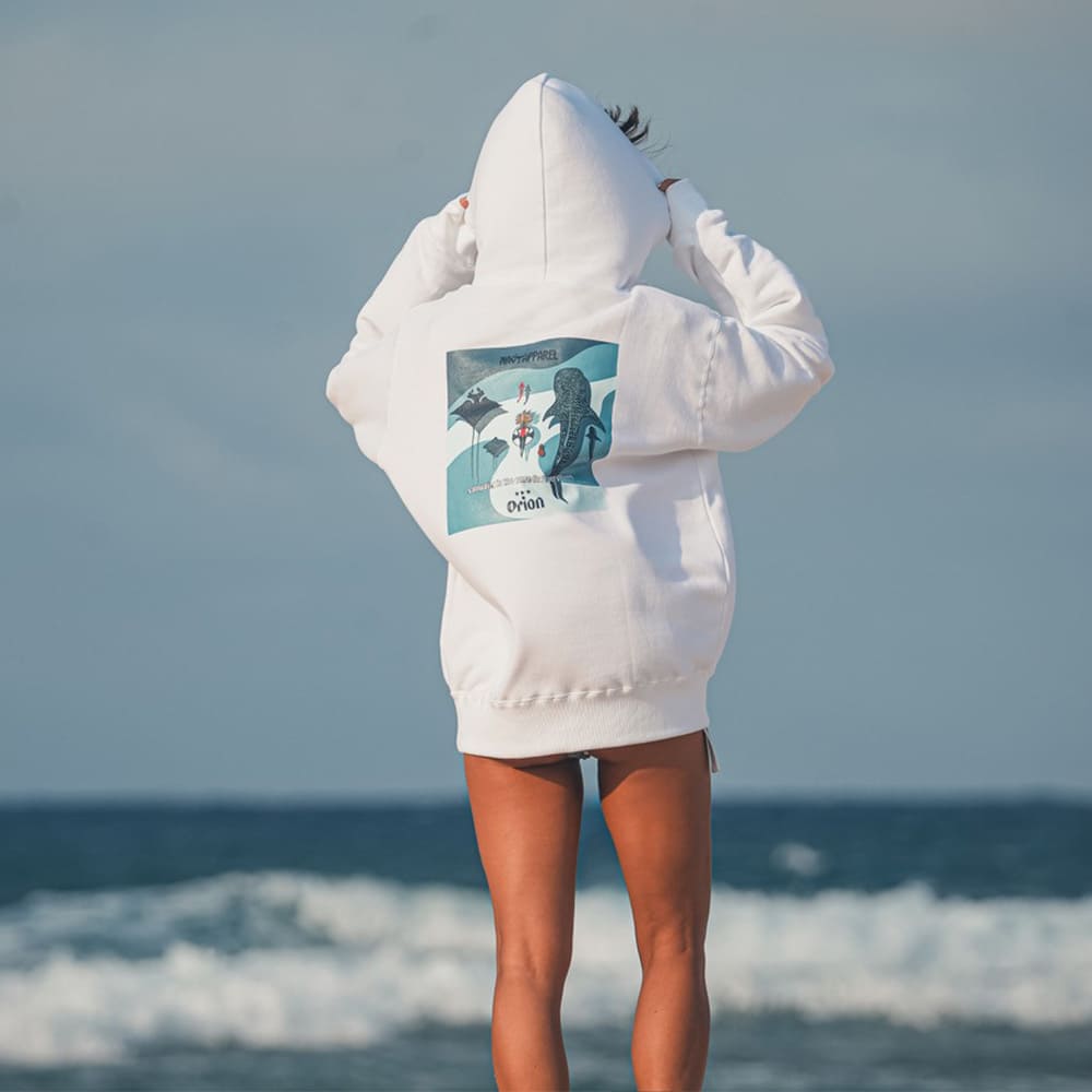 カラーはホワイトとグレーの2色で、バックプリントの海のブルーが映えるこだわりのパーカーです。