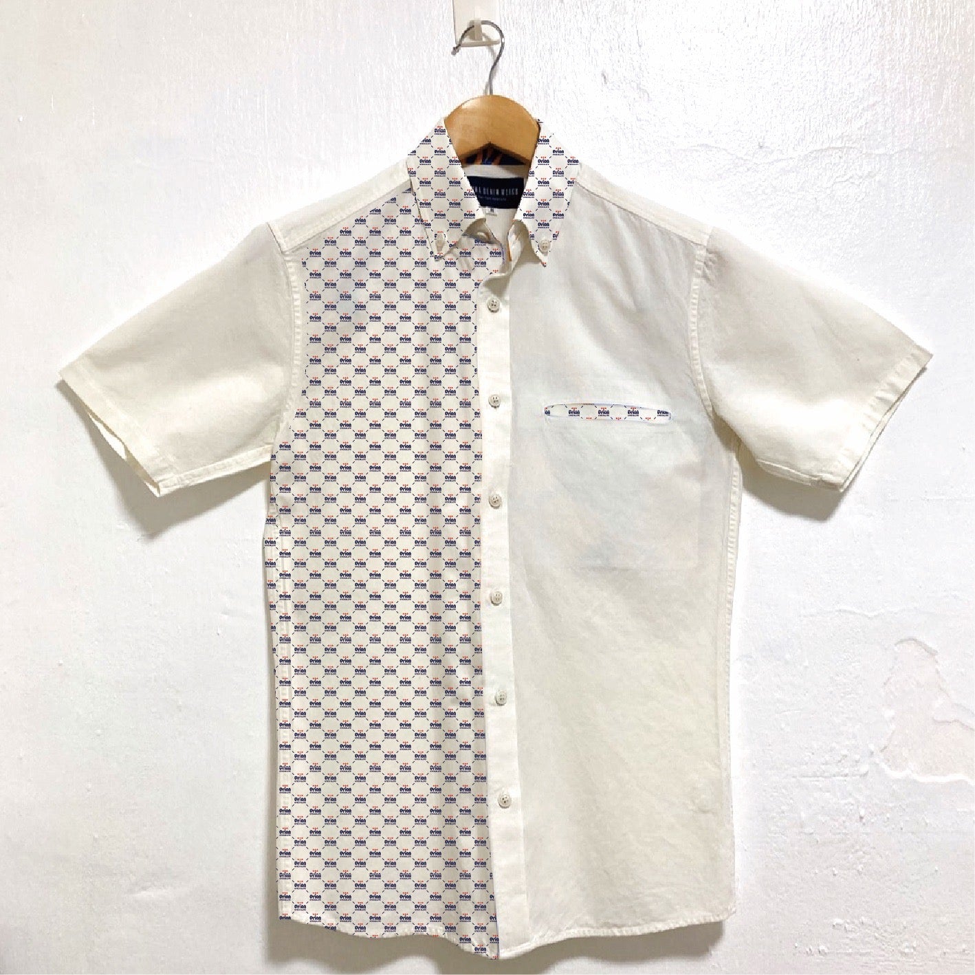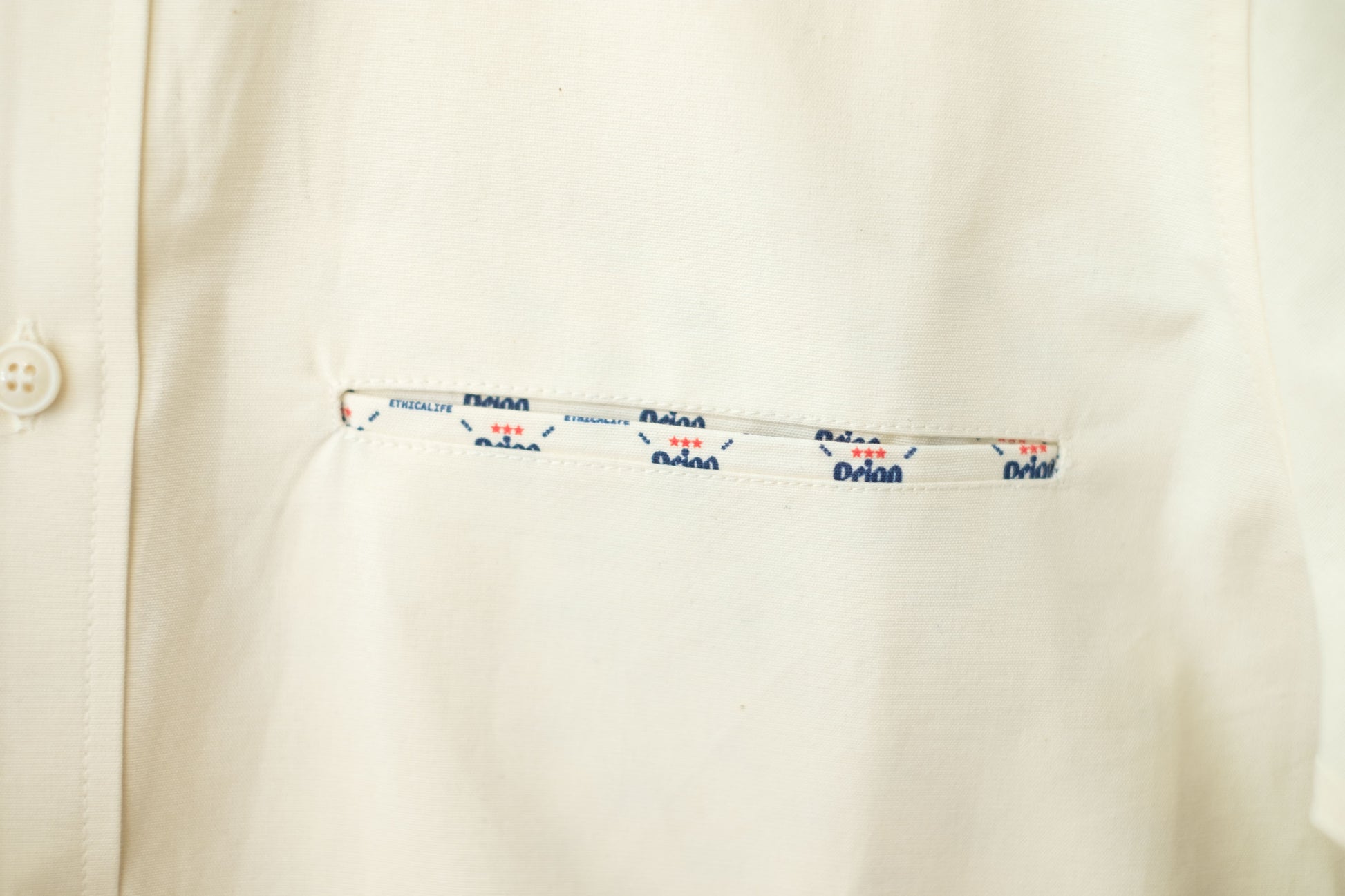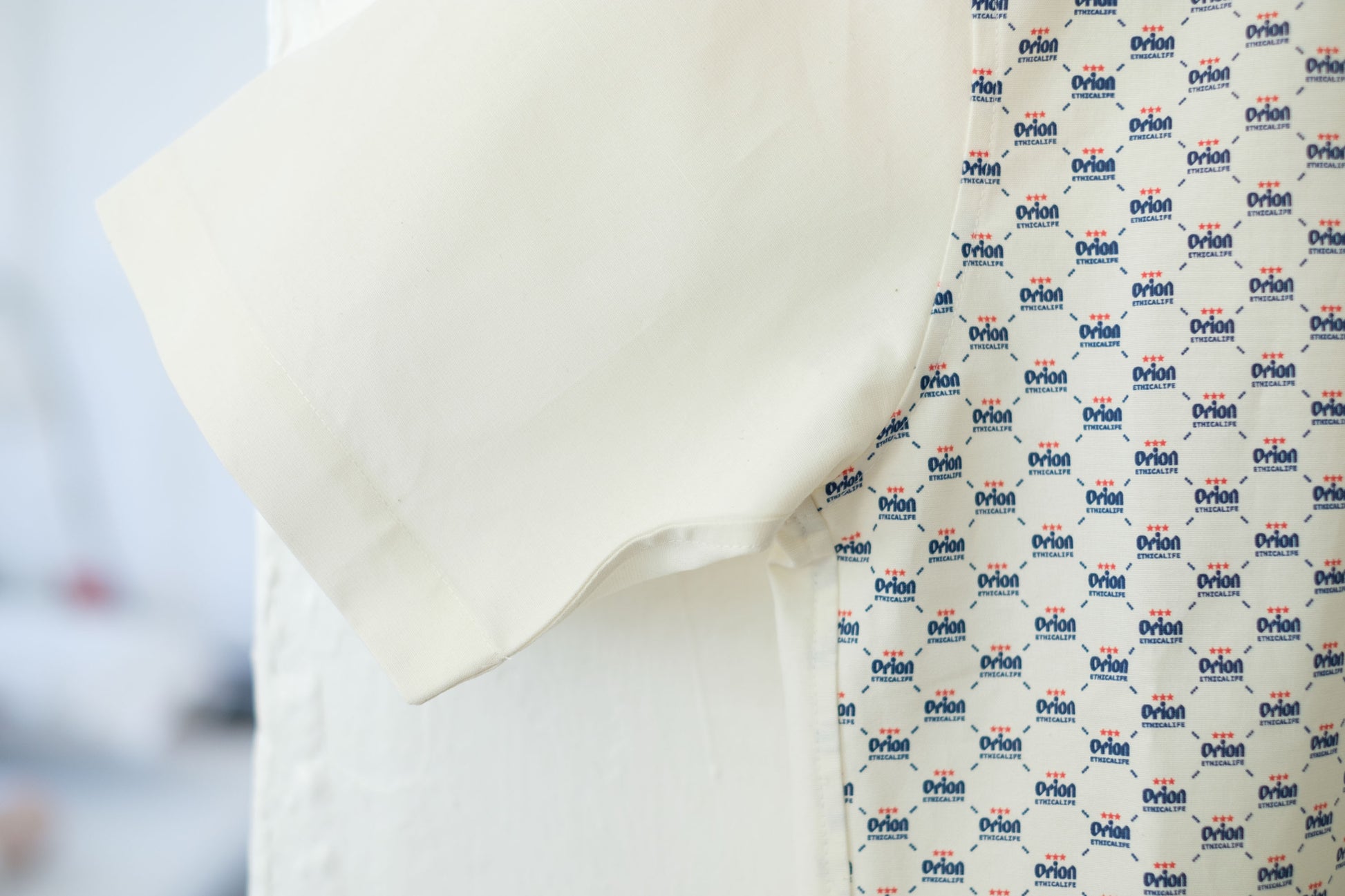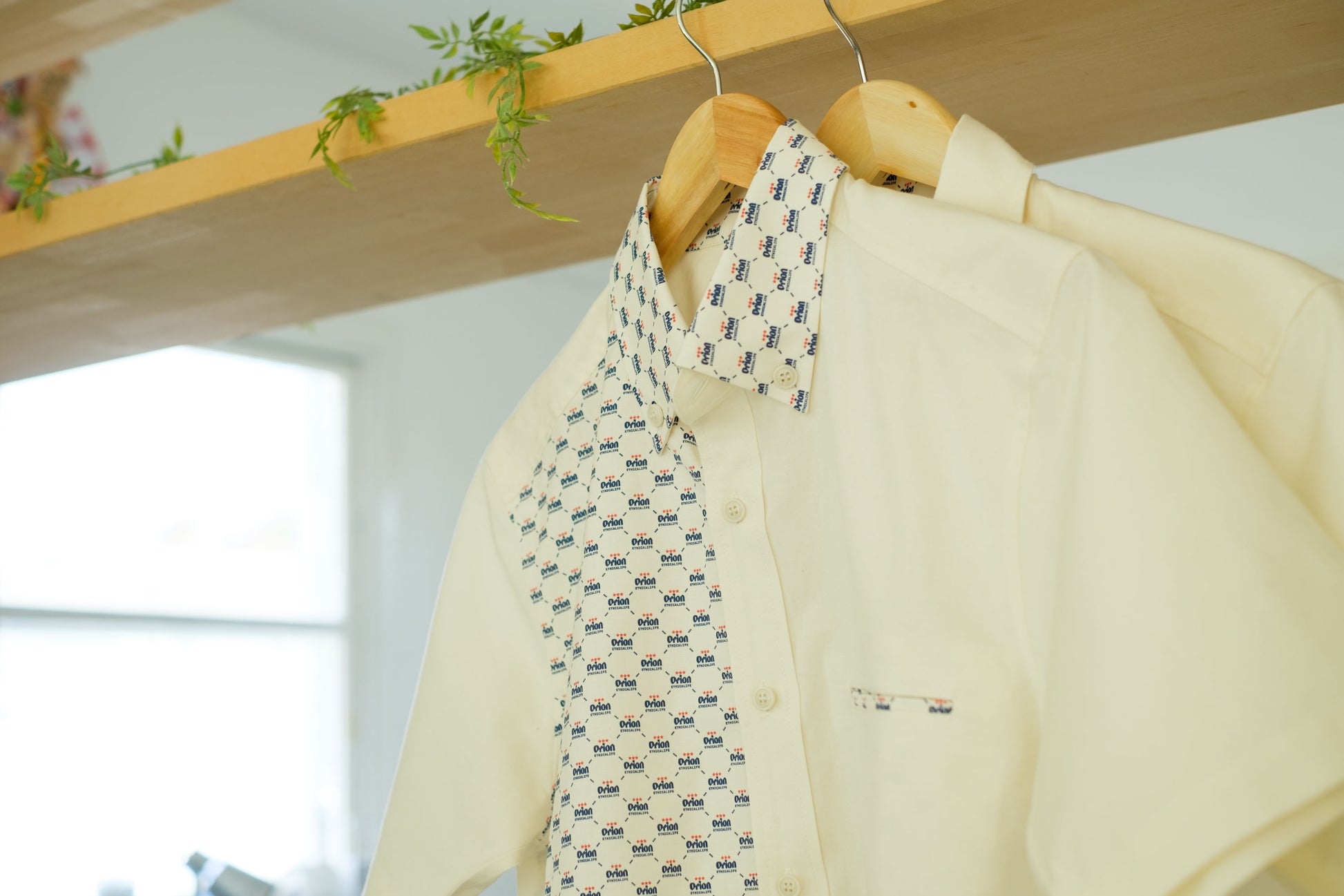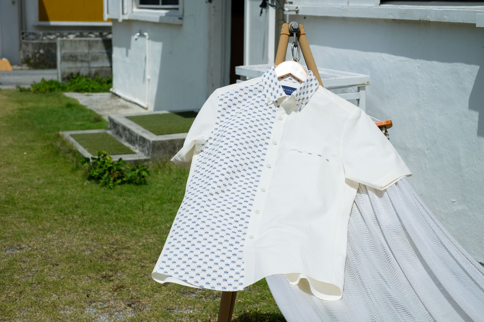 かりゆしウェアは、モノグラム柄の生地と生成りの生地を組み合わせ、沖縄の縫製工場で仕立てます。