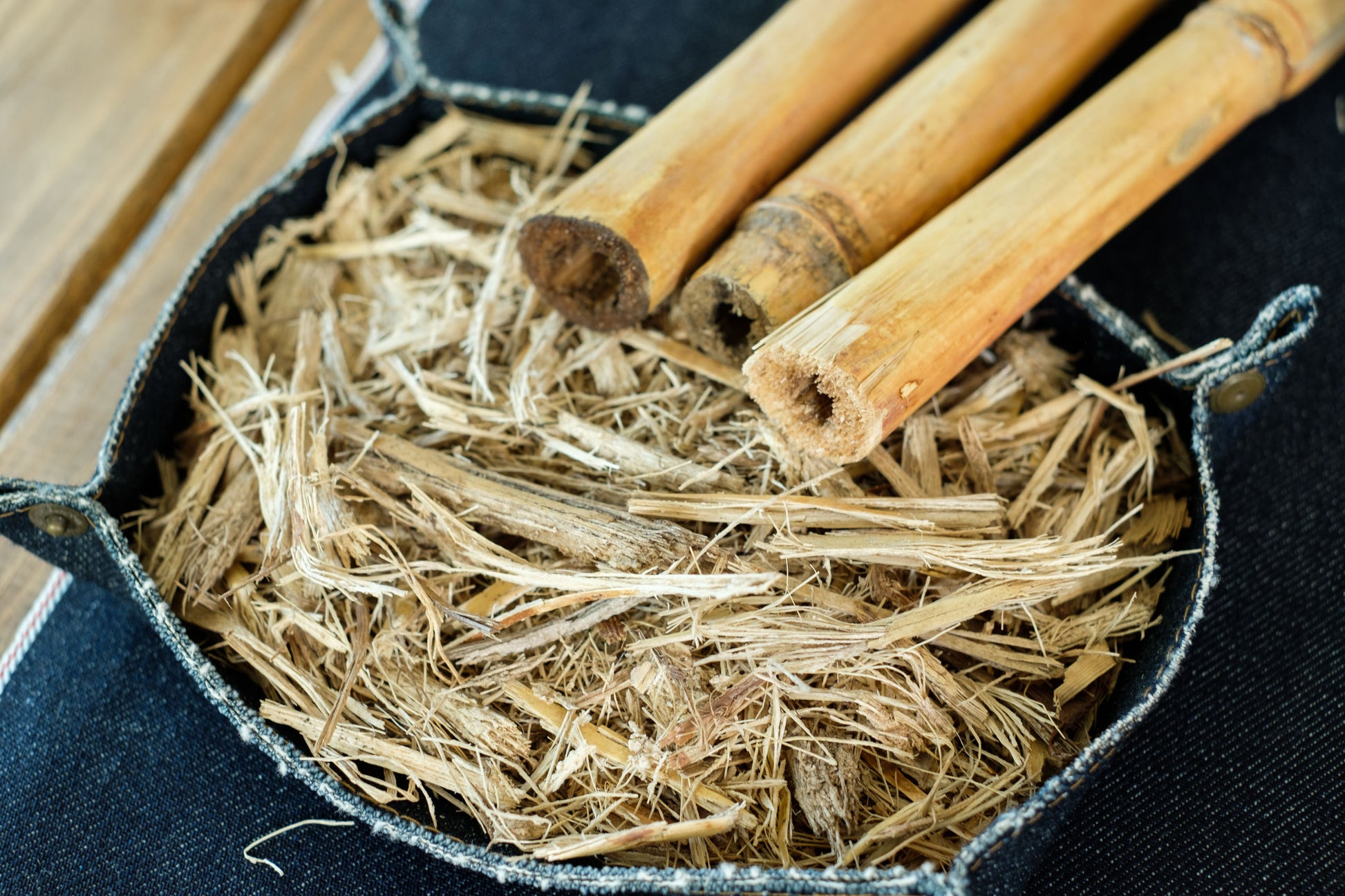 サトウキビの搾りかす(バガス)は、パウダー状に加工された後に融解され、日本の伝統工芸品である美濃和紙の職人技による紙漉きの工程を経て、加工し易い丈夫な和紙糸に変わります。その和紙糸は、Japan Denimの一大産地である福山市の工場にて、環境に配慮したコットンと織り合わせられ、ようやく生地として仕上がります。