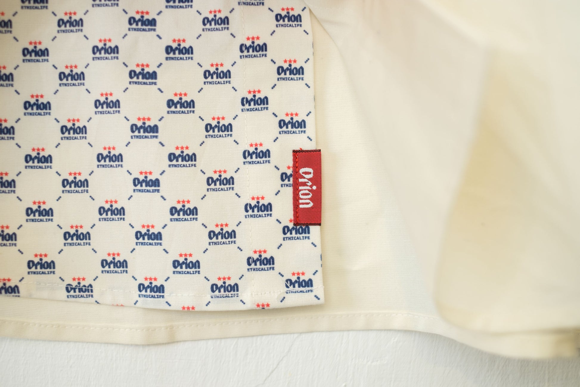 オリオンビールのロゴマークをモノグラム調に配置したシンプルなデザインは、沖縄のリゾートウェアとしての使用はもちろん、夏場の日常利用にもぴったりな一着。沖縄の縫製工場にて一つひとつ仕立てます。