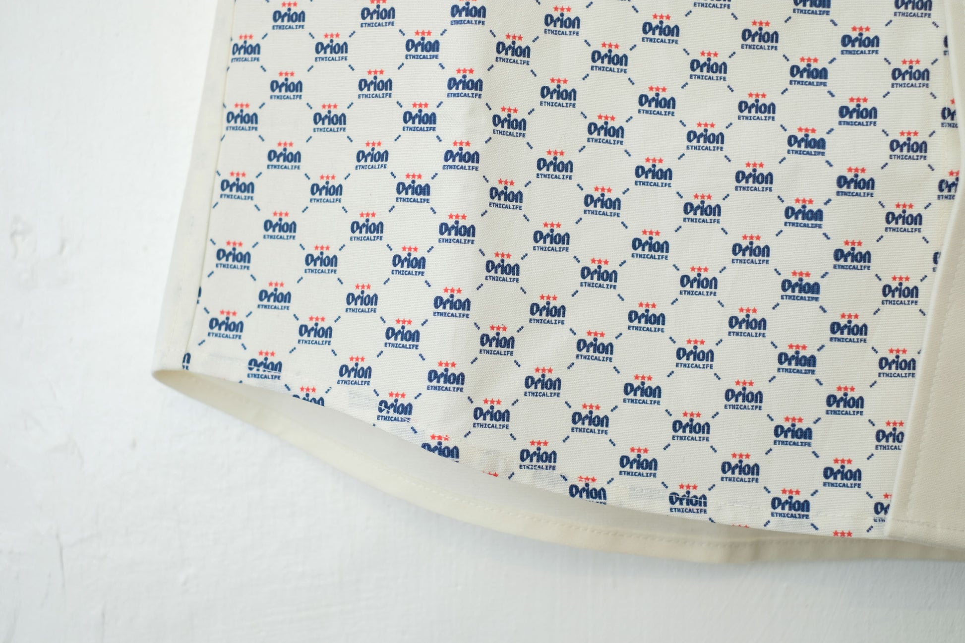 できあがった生地に、オリオンロゴとSHIMA DENIM WORKSが展開するサステナブルな衣料・雑貨ブランド「ETHICALIFE」のモノグラム柄をプリント。このコラボだけのオリジナルデザインです。
